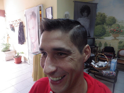 Respondi-lhe que essa era a minha "praia" e que saber mudar só trás vantagens para o cliente e para o cabeleireiro-babeiro, e assim foi.Num cabelo fino mas denso, a tesoura dentada, permitiu na parte superior a desejada leveza do cabelo. O movimento frontal foi levantado com algum calor do secador, trabalhando a risca numa fase com a maquina e depois mais vincada com a navalha